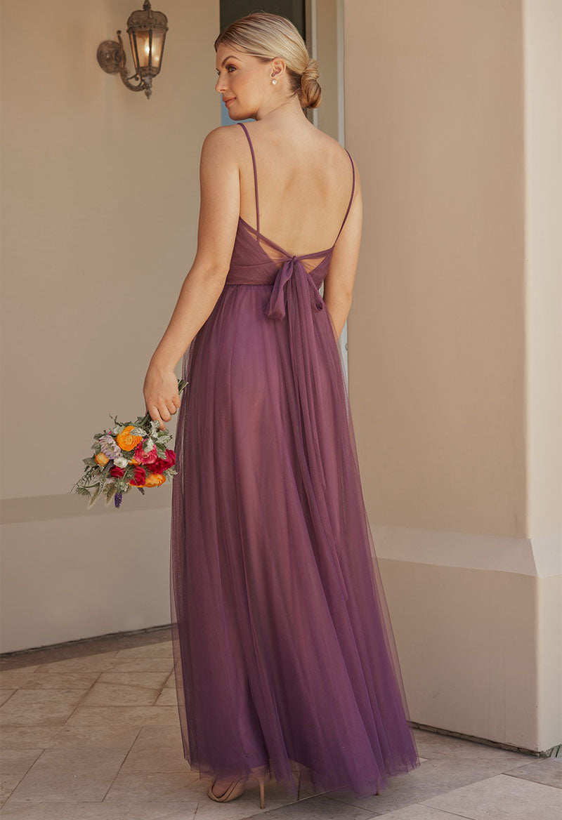 V Neck Sleeveless Tulle Appliqué A Line Floor Length Bridesmaid Dress