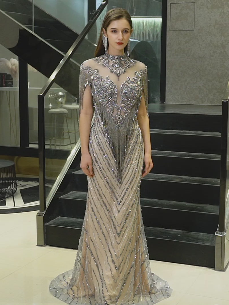 Fringed Beaded High Neck Short Sleeve Evening Dress