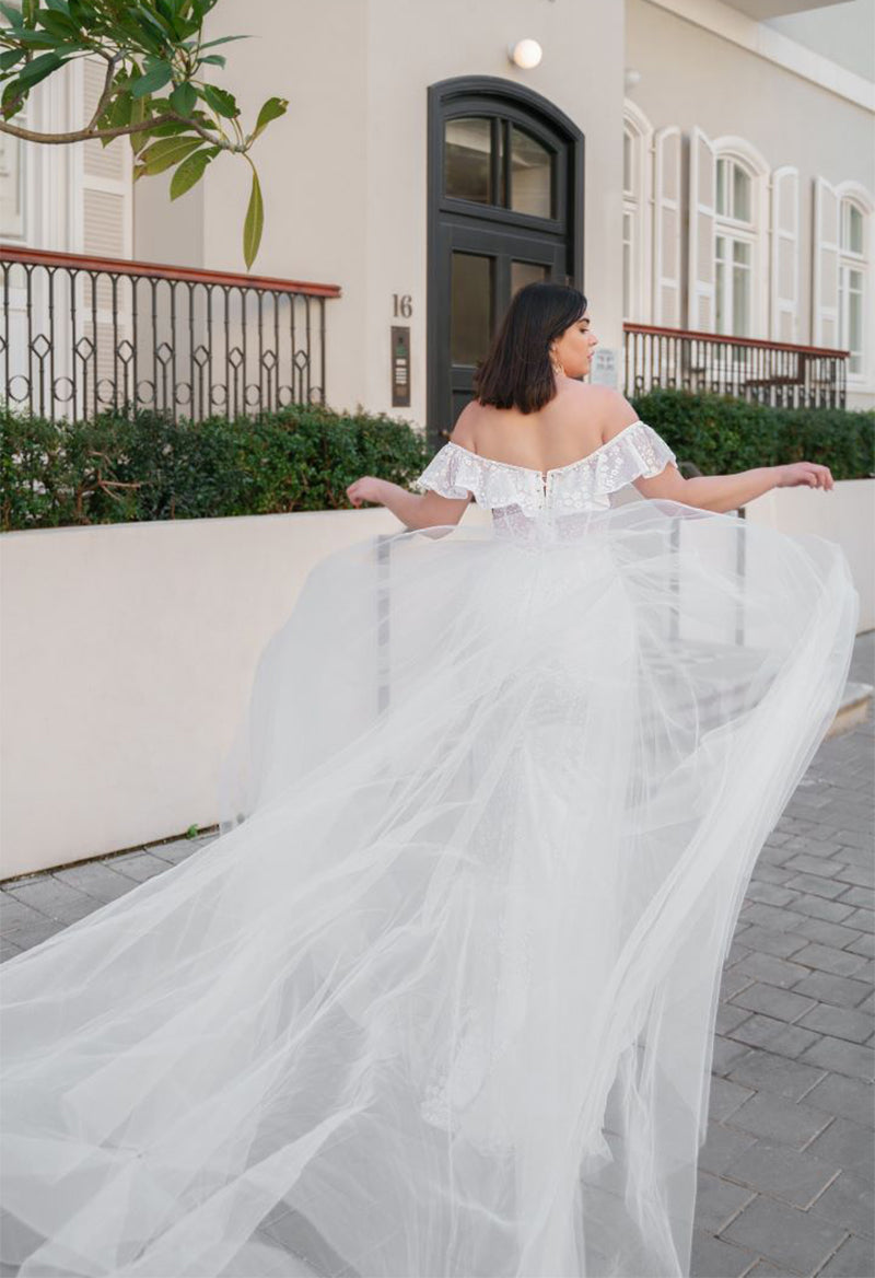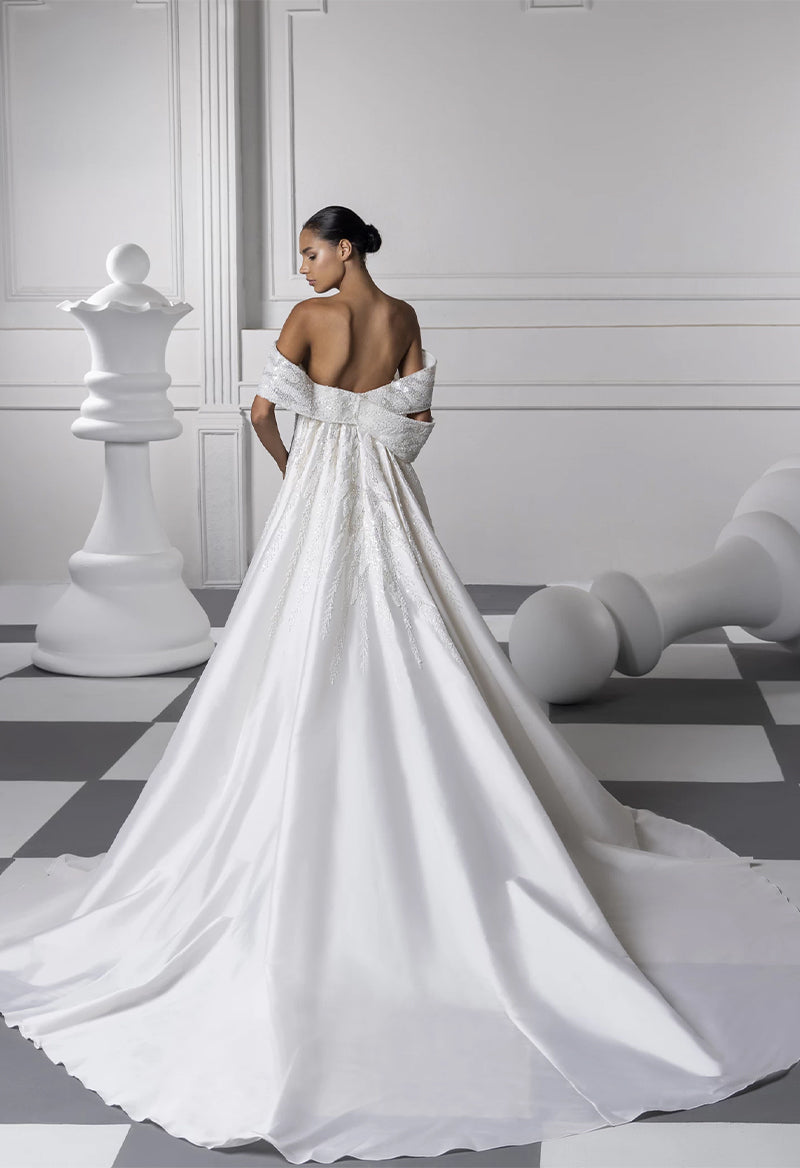 Off The Shoulder Sequined Satin Sheath Floor Length Wedding Dress With Overskirt