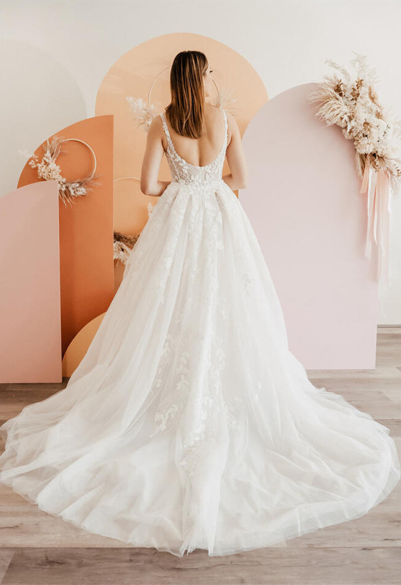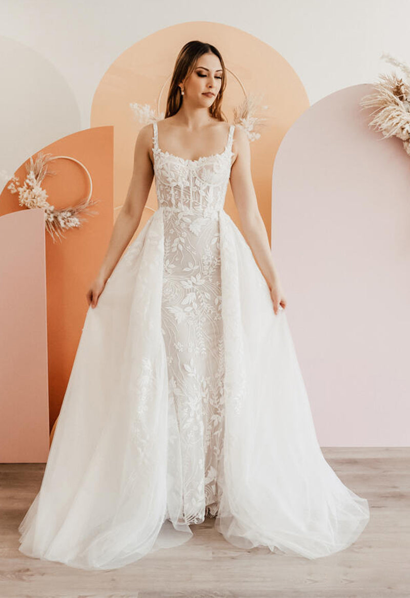 Square Neck Sleeveless Sheath Sweep Train Wedding Dress With Overskirt