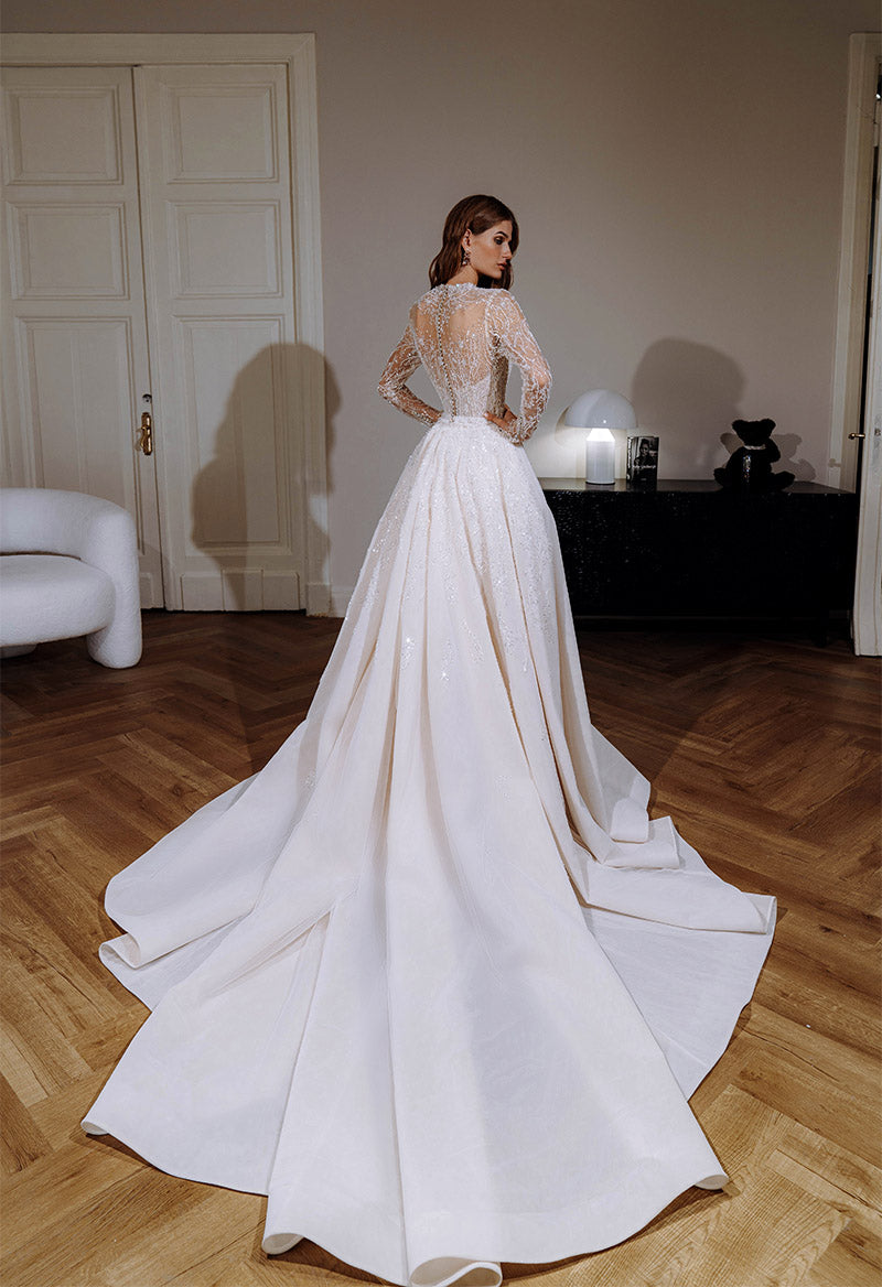 High Neck Sequin Lace Long Sleeve Sheath Sweep Train Wedding Dress With Overskirt