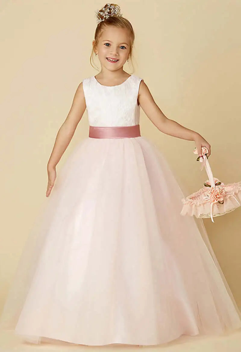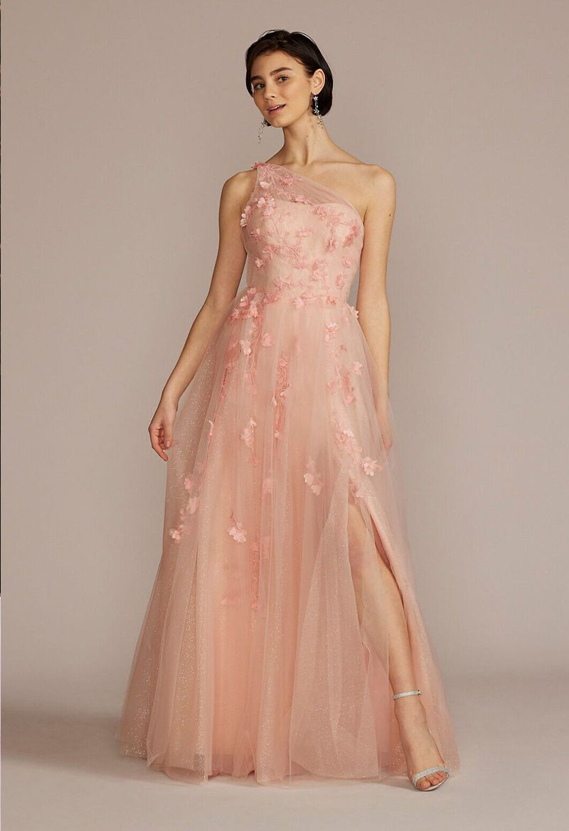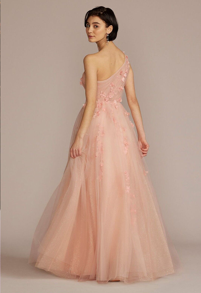 Vestido de dama de honor hasta el suelo sin mangas de tul brillante con flores de un hombro
