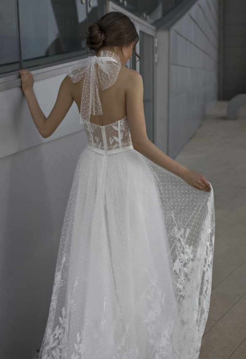 Halter Neck Sleeveless Backless Elegant Lace Chapel Train Wedding Dress