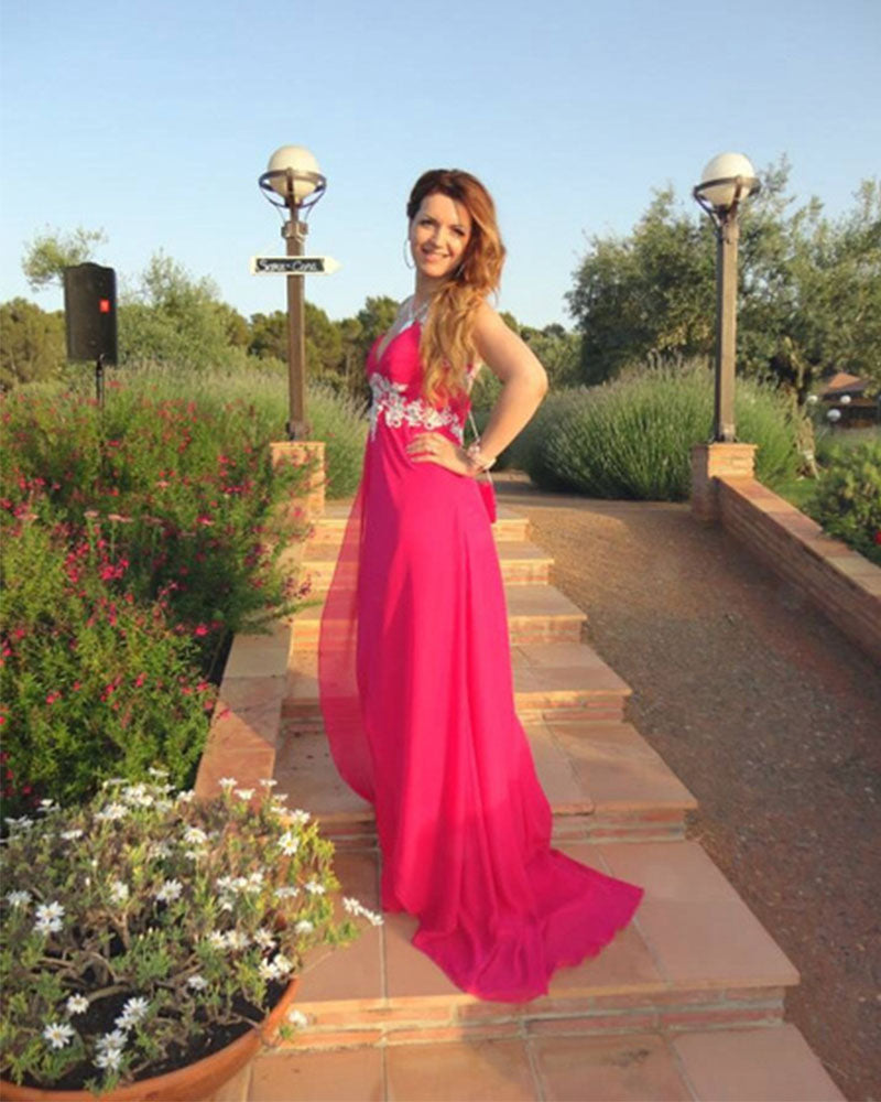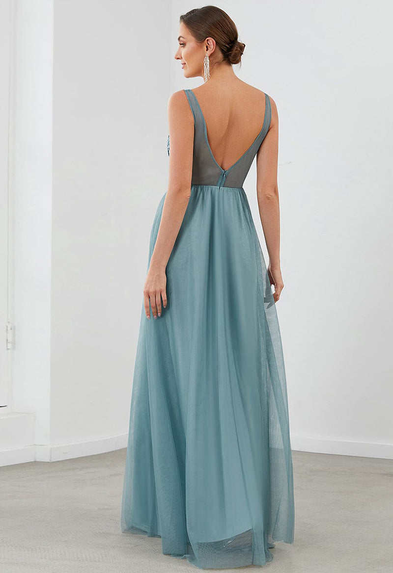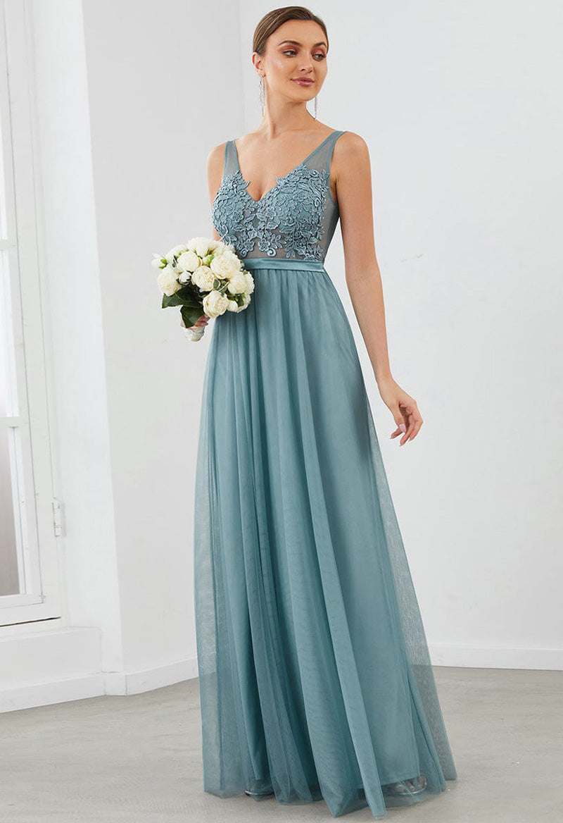 Vestido de dama de honor hasta el suelo con escote en V y apliques de tul sin mangas