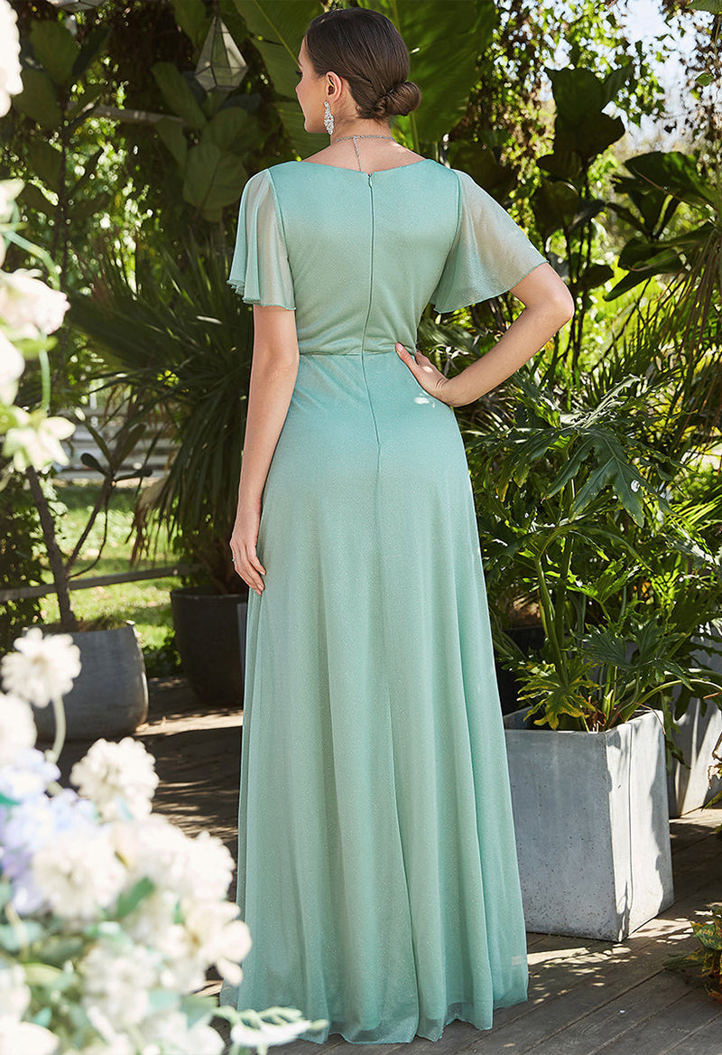 V-Neck Short-Sleeved Ruffled Slit Bridesmaid Dress