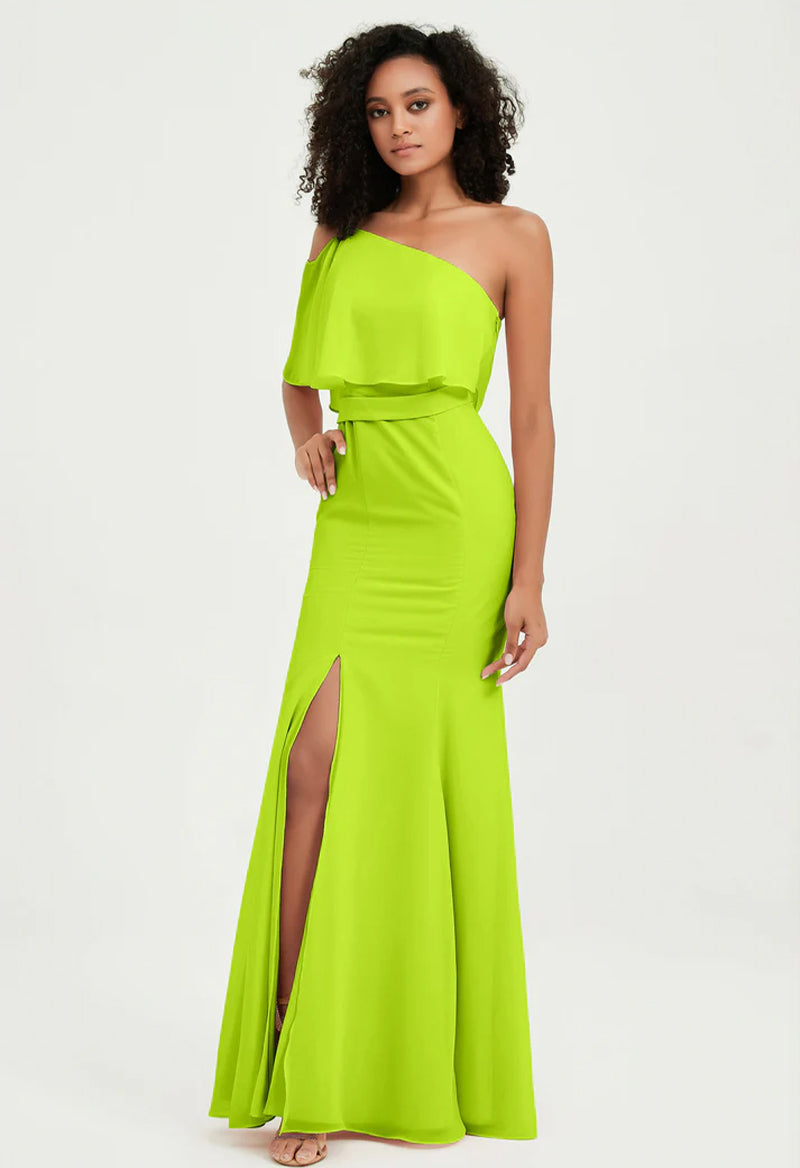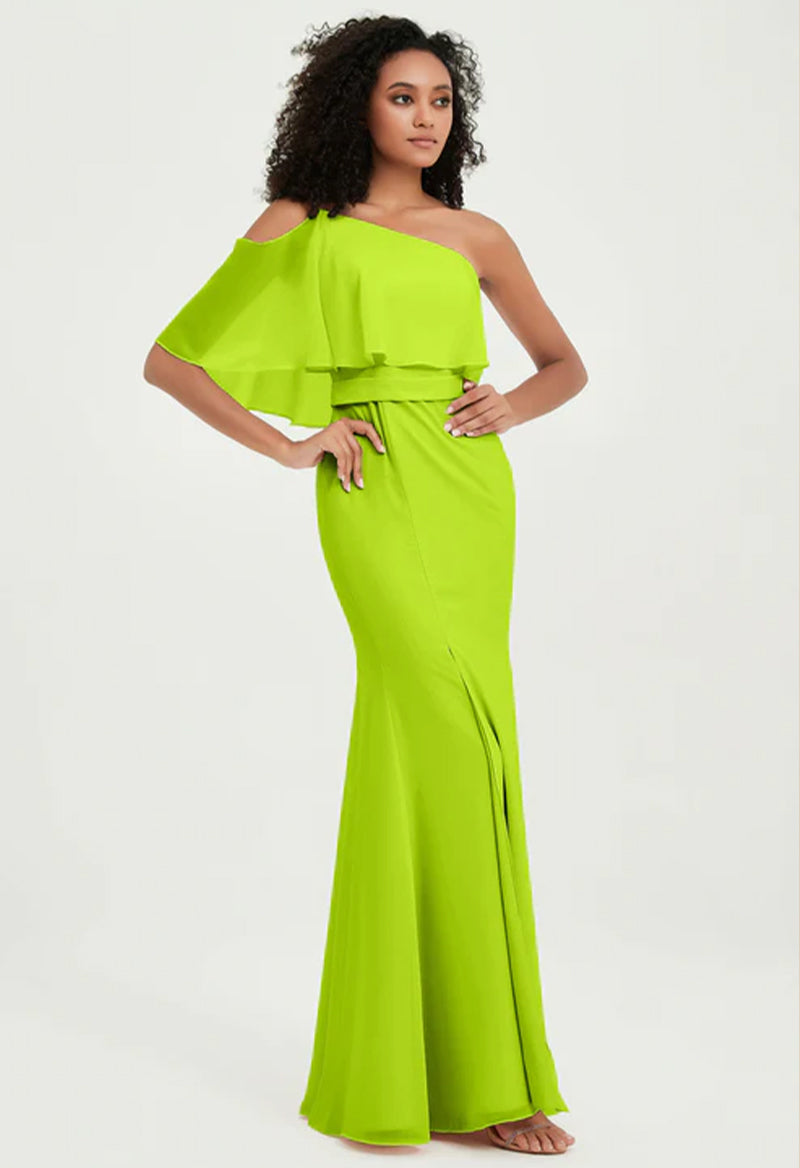 Lime Green One Shoulder Sleeveless Slit Chiffon Floor Length Bridesmaid Dress