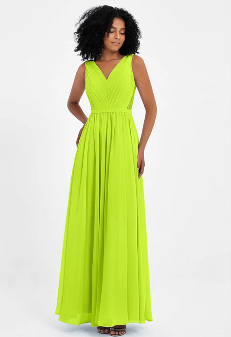 Lime Green V Neck Sleeveless Pleated Chiffon Floor Length Bridesmaid Dress