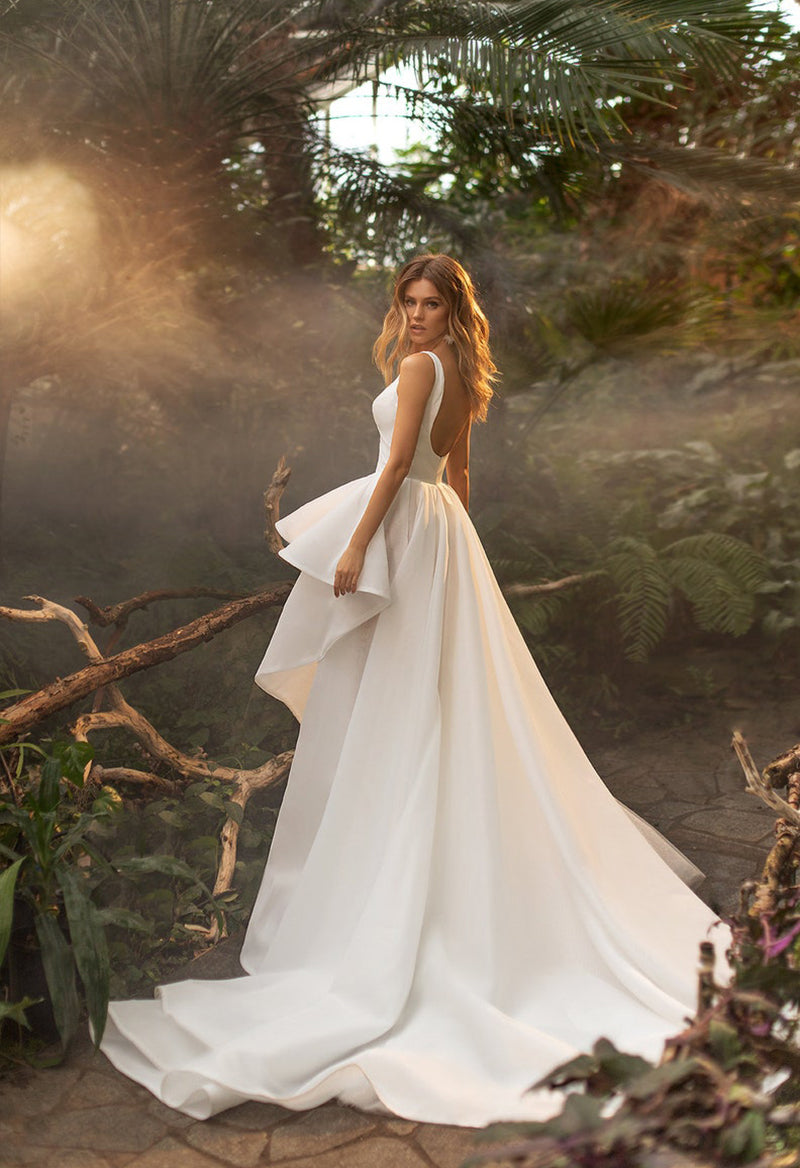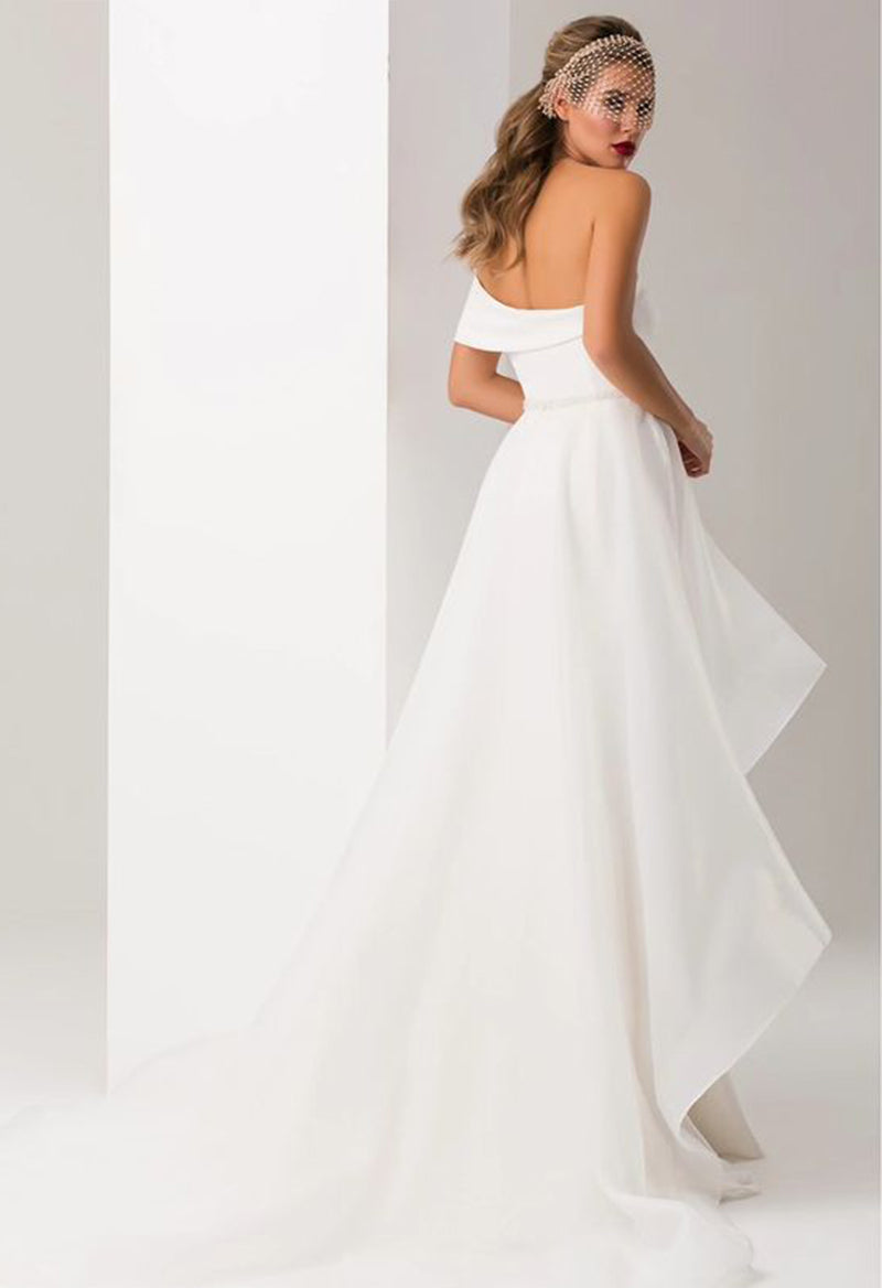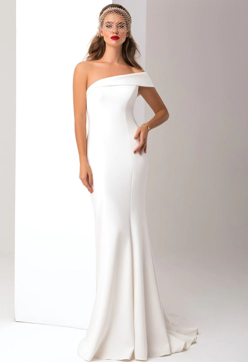 Simple One Shoulder Sheath Satin Wedding Dress With Ruffle Overskirt