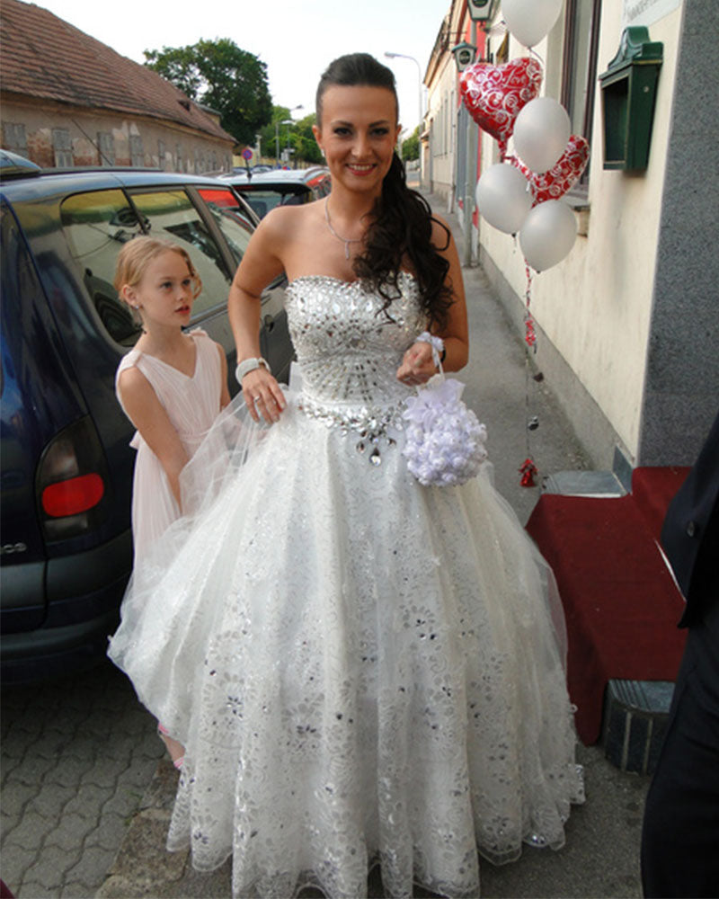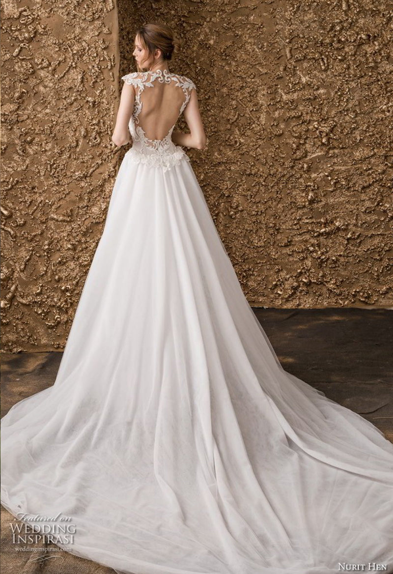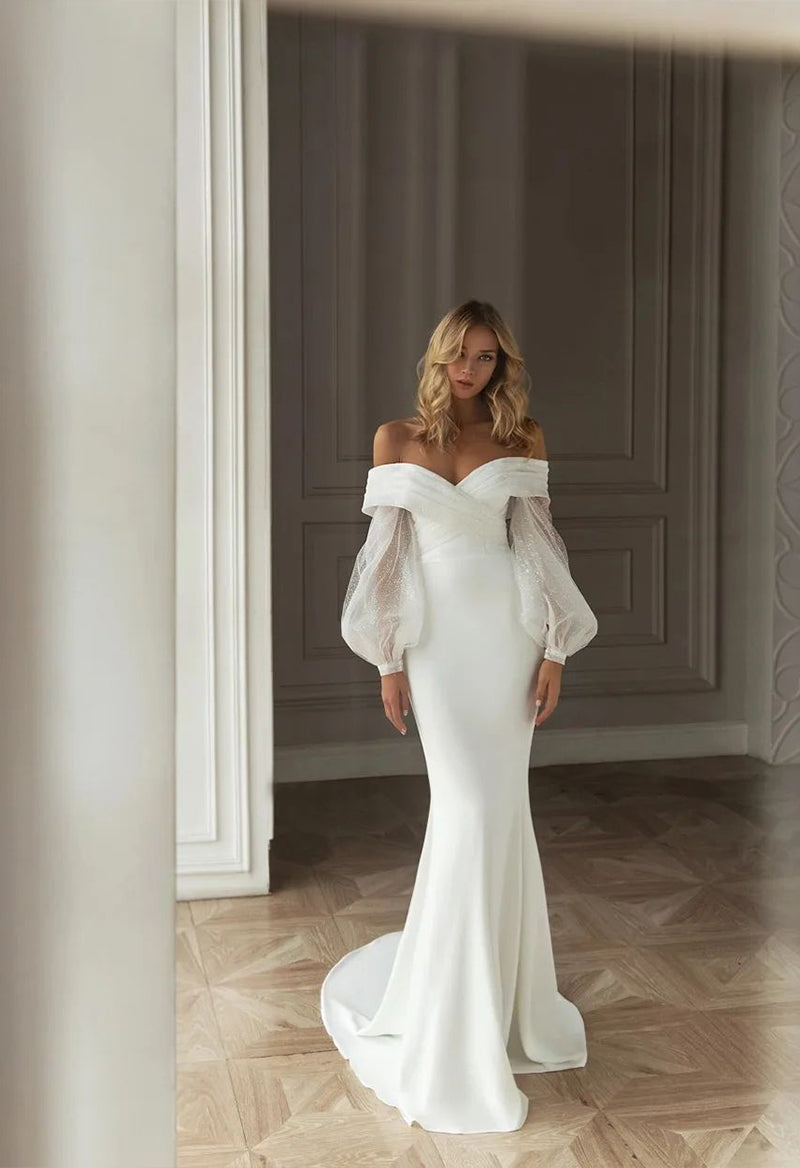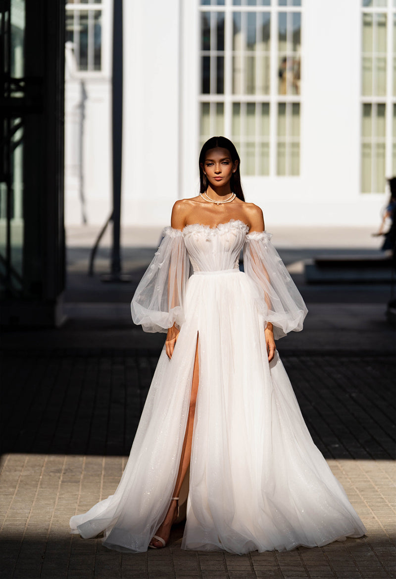 Puff Sleeves Sparkly Tulle Sheath Court Train Wedding Dress