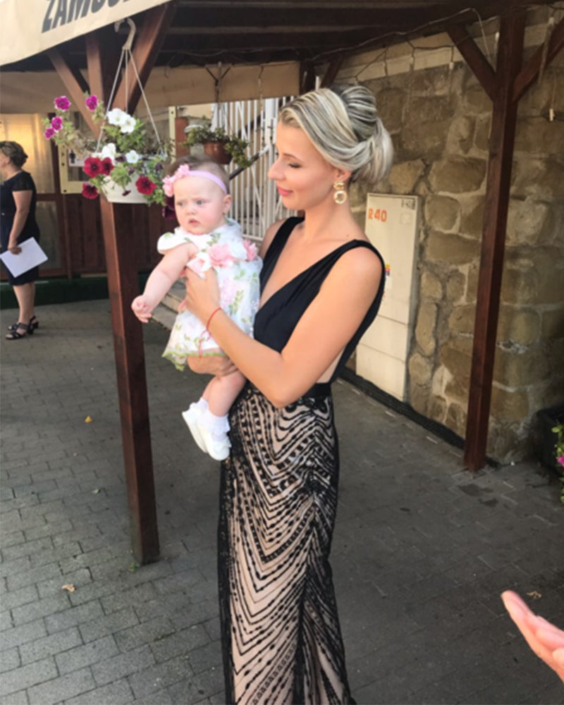 Vestido de fiesta con cuello de corazón y mangas abullonadas con flores y tren de barrido