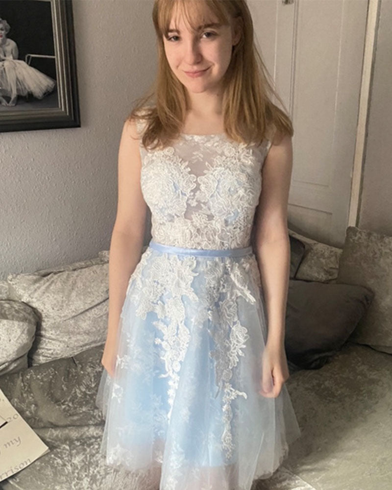 Vestido corto de regreso a casa con apliques de manga extraíble y lazo con tirantes finos transparentes