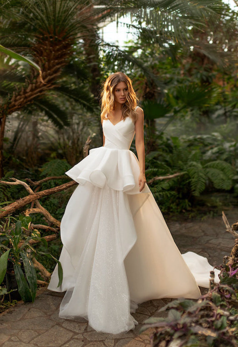 Vestido de novia de cola de capilla sin mangas de tul brillante con volantes y cuello en V