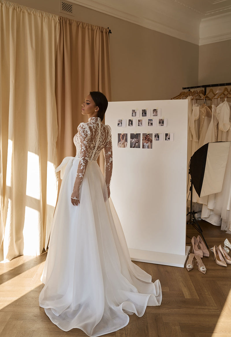 High Neck Long Sleeve Bow Lace Slit Sweep Train Wedding Dress