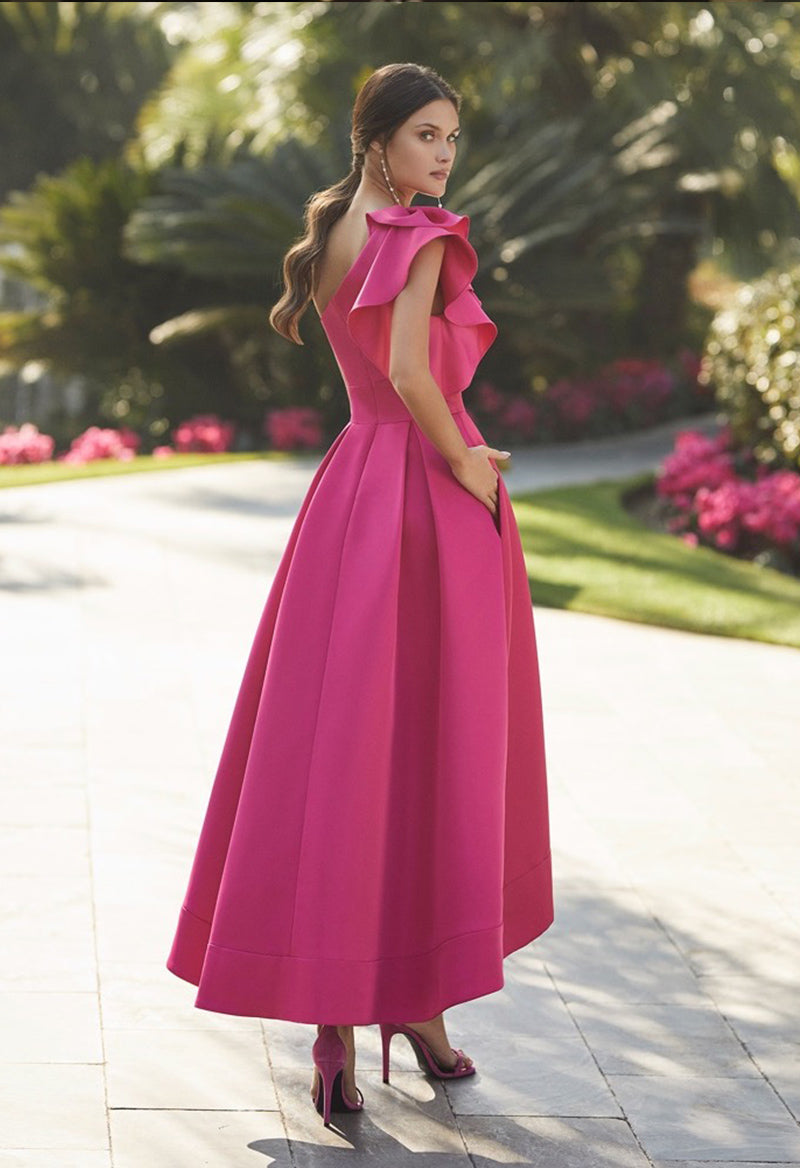 Vestido de noche de longitud hasta el té, sin mangas, con volantes y un hombro