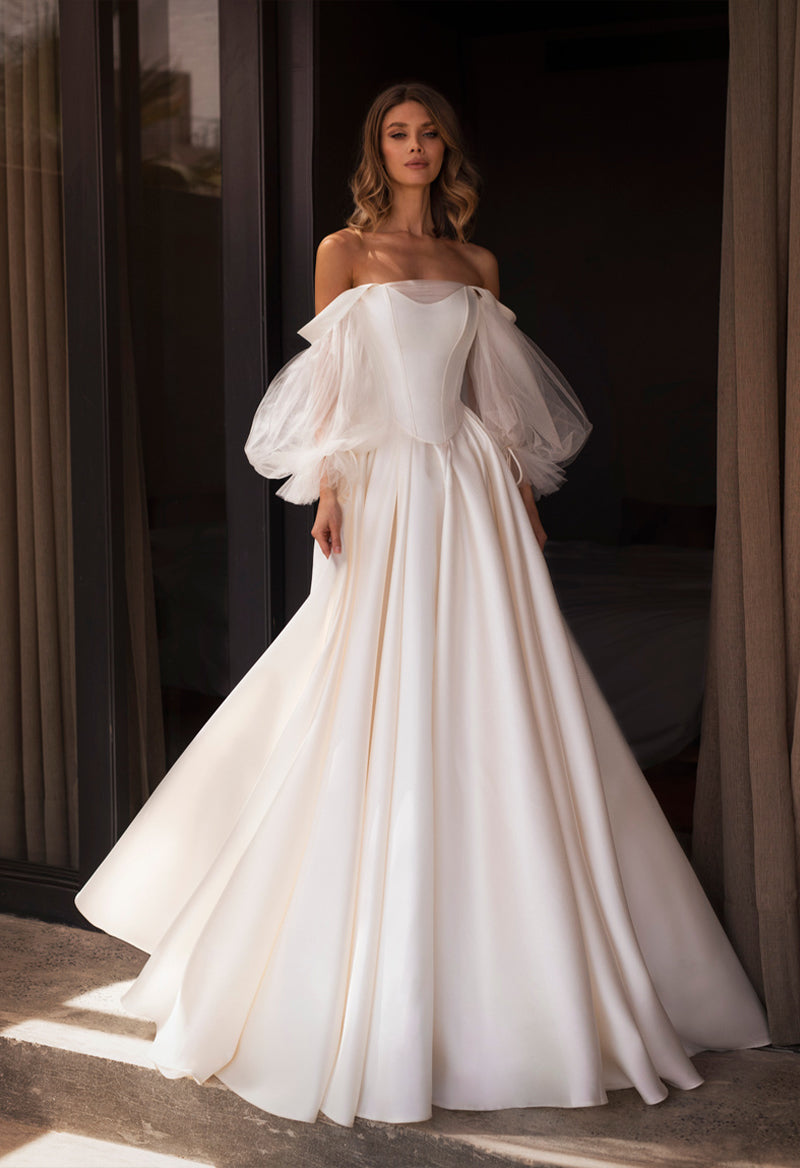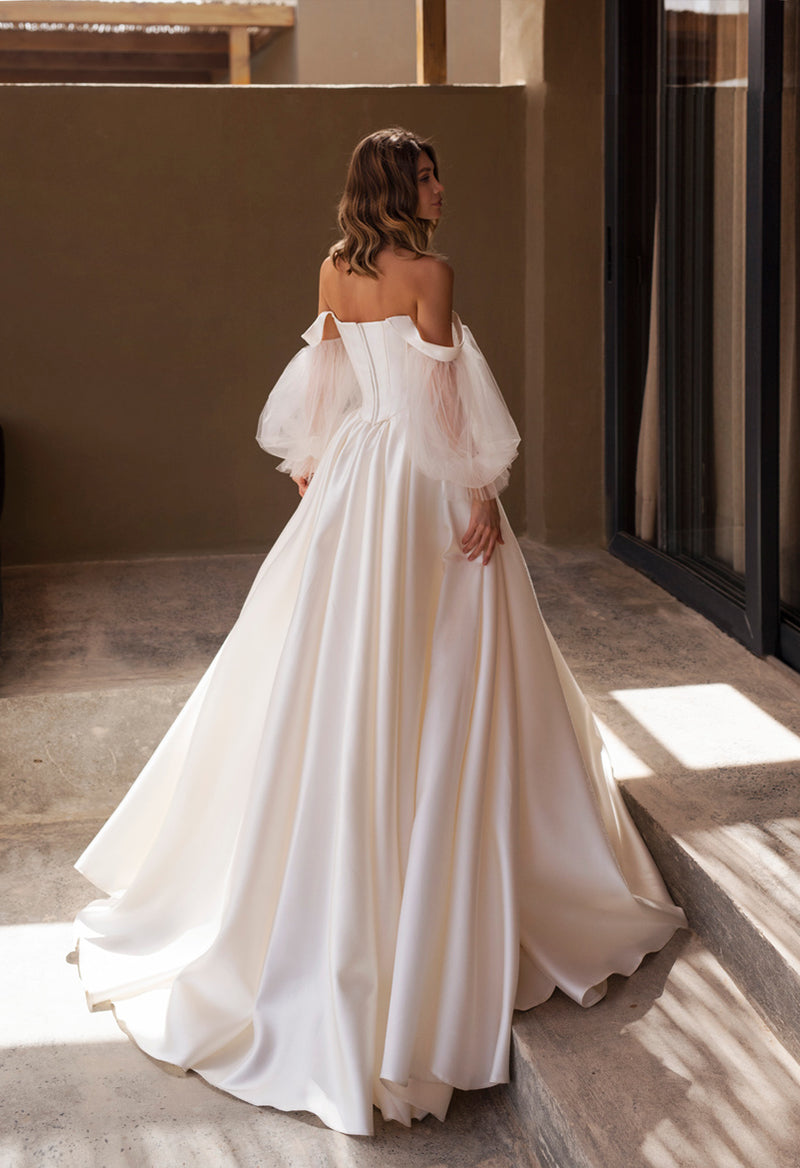 Sexy Straight Neck Puff Sleeve Slit Satin Wedding Dress