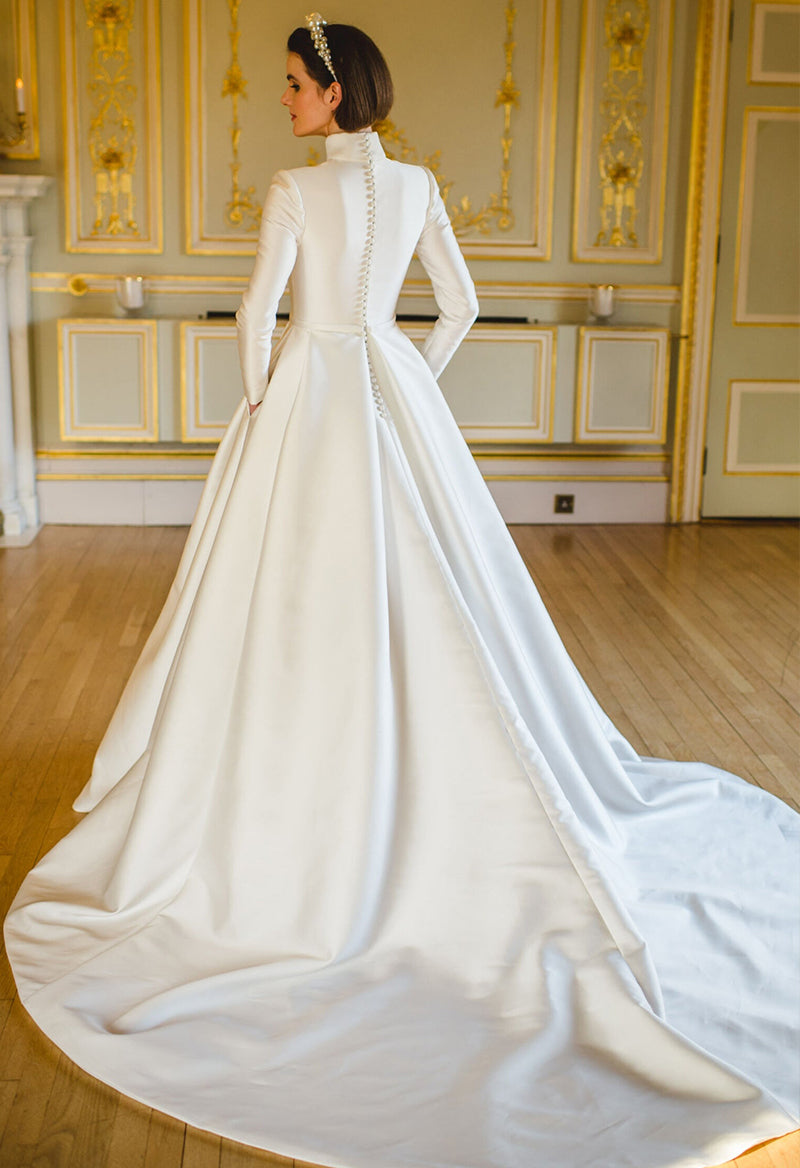 Simple High Neck Long Sleeve Satin Chapel Train Wedding Dress