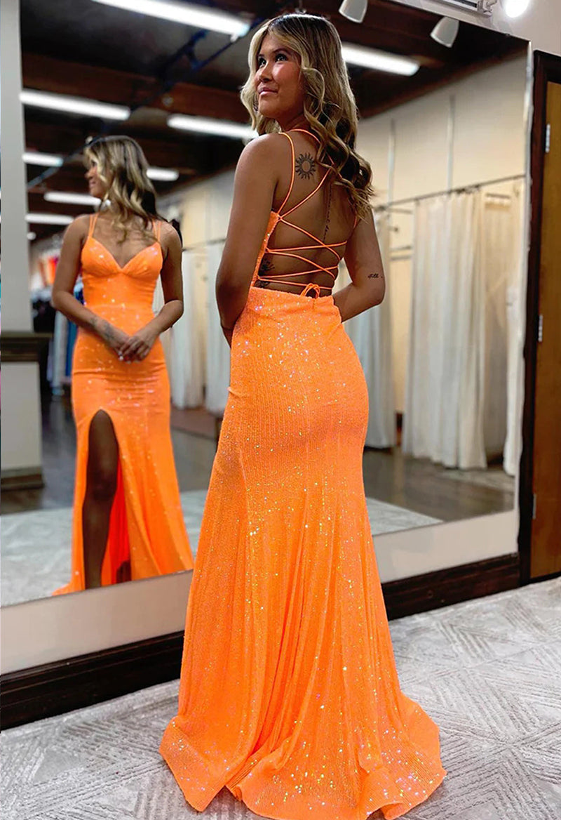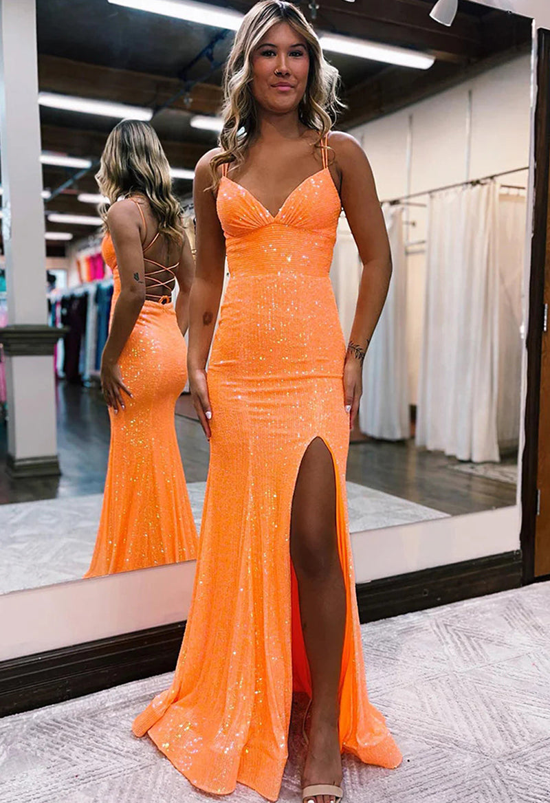 Vestido de fiesta con escote en V, sin mangas, tubo, lentejuelas, cola con abertura