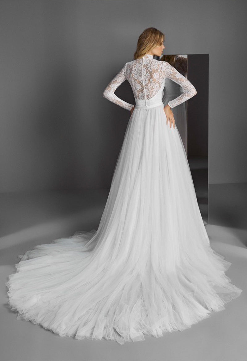 Conservative Long Sleeves High Neck Slits Tulle Chapel Train Wedding Dress