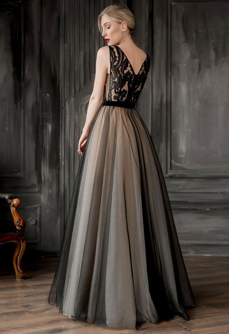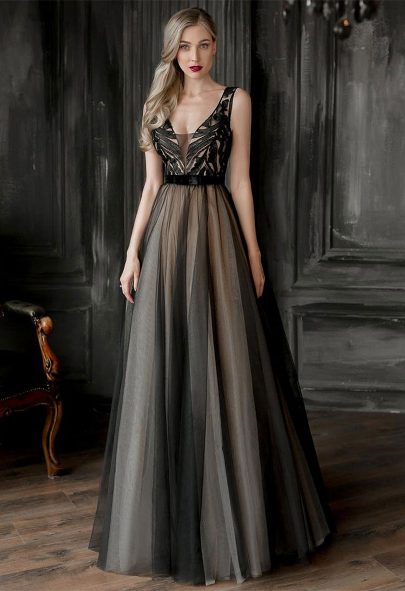 Vestido de fiesta de línea A de encaje de malla sin mangas con cuello en V