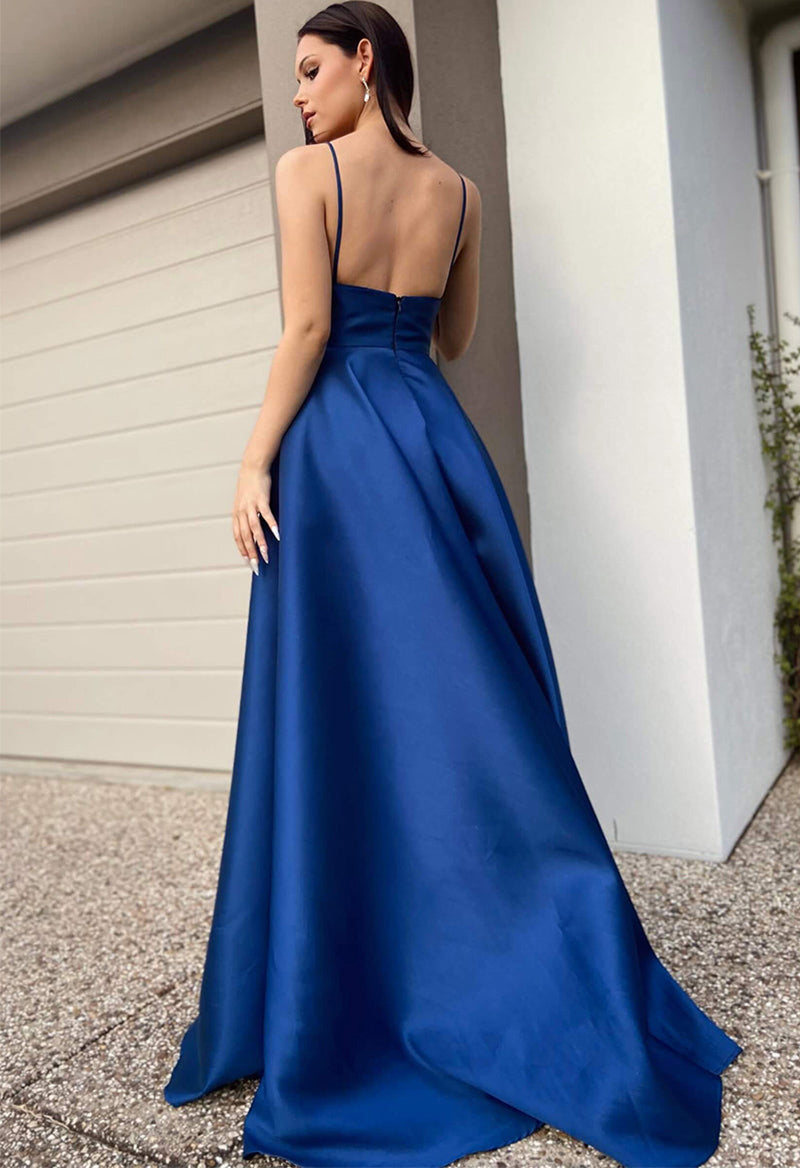 Vestido de noche de tren de barrido sin mangas con cuello en V de satén liso