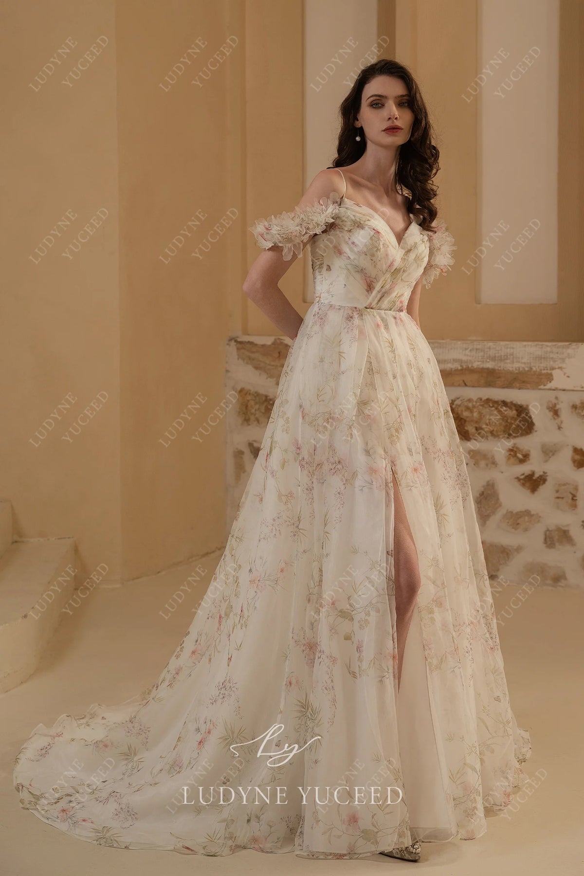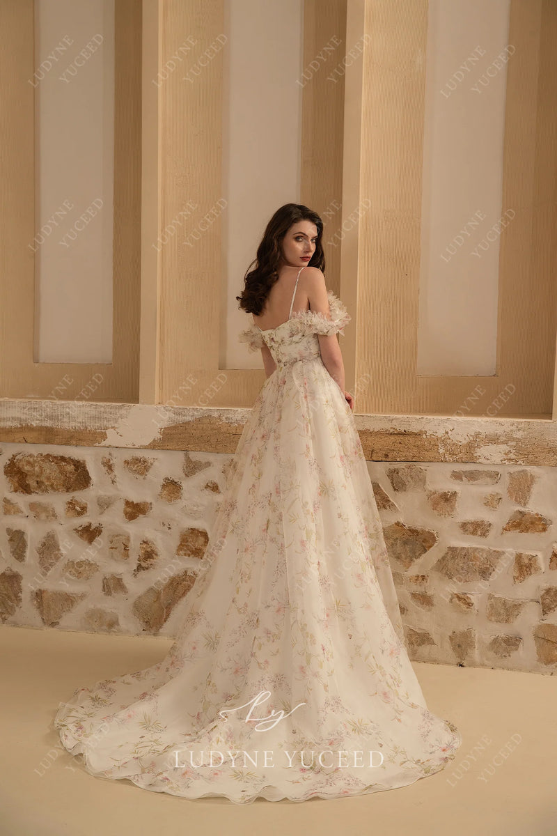 Vestido de novia con escote en forma de corazón, manga abullonada, corte en A, tul, cola de corte de flores en 3D