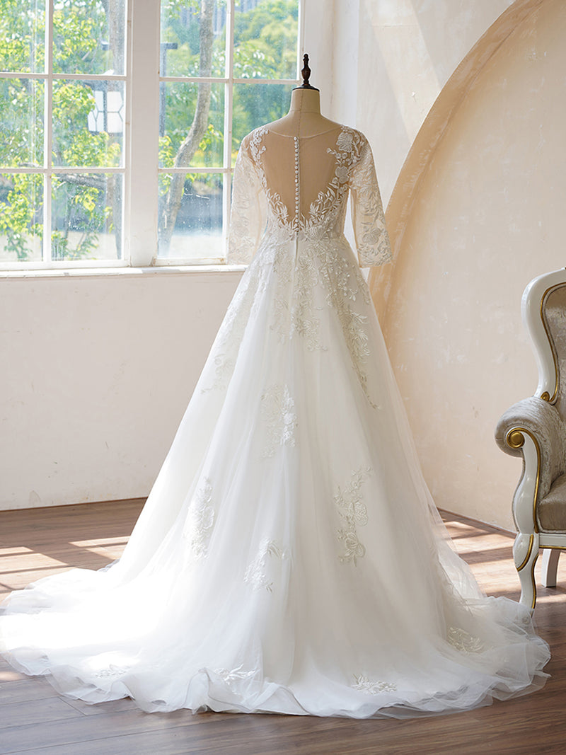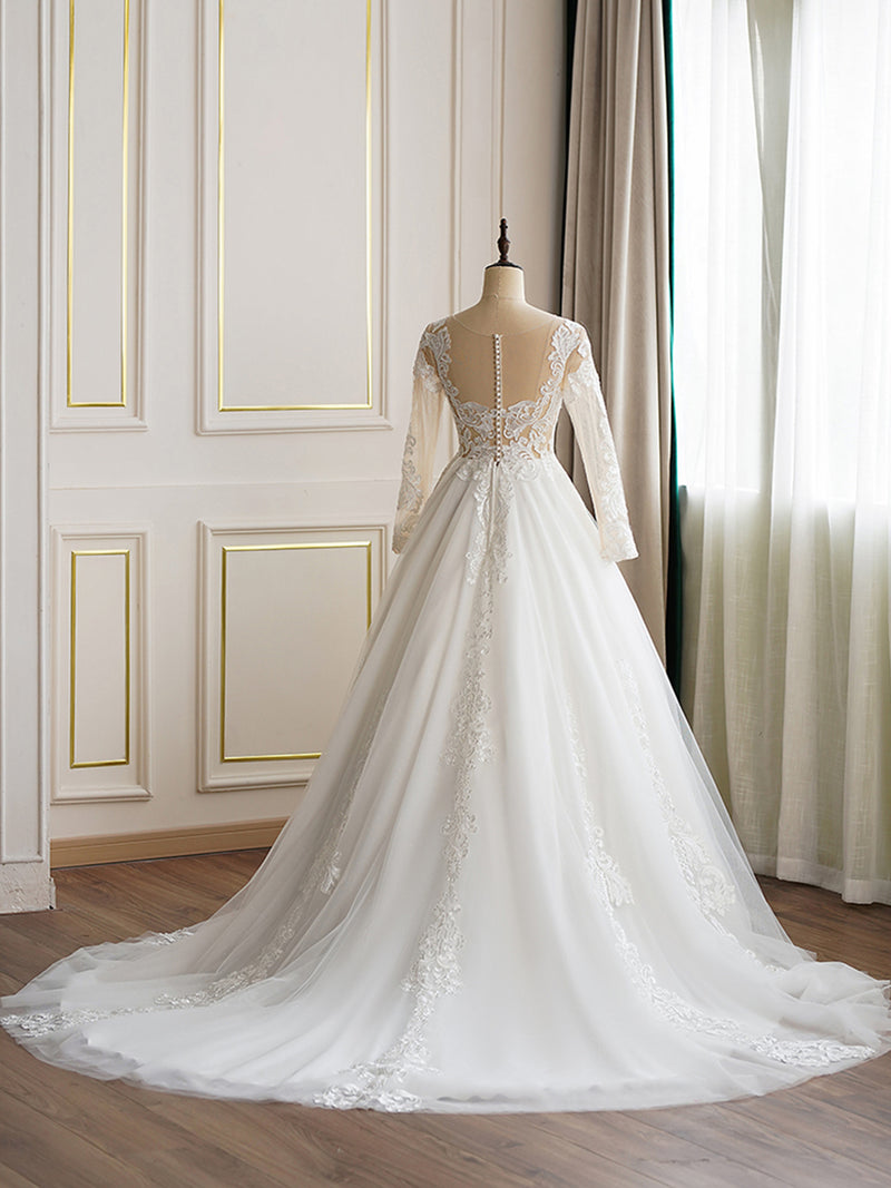 Robe de mariée florale en dentelle à manches longues et décolleté illusion