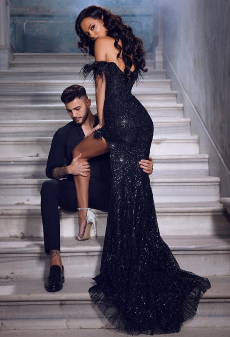 Robe de bal à épaules dénudées et fente en plumes avec traîne et traîne