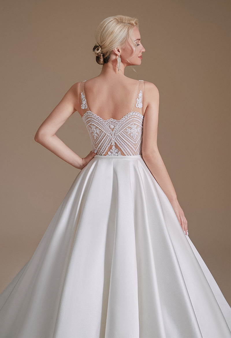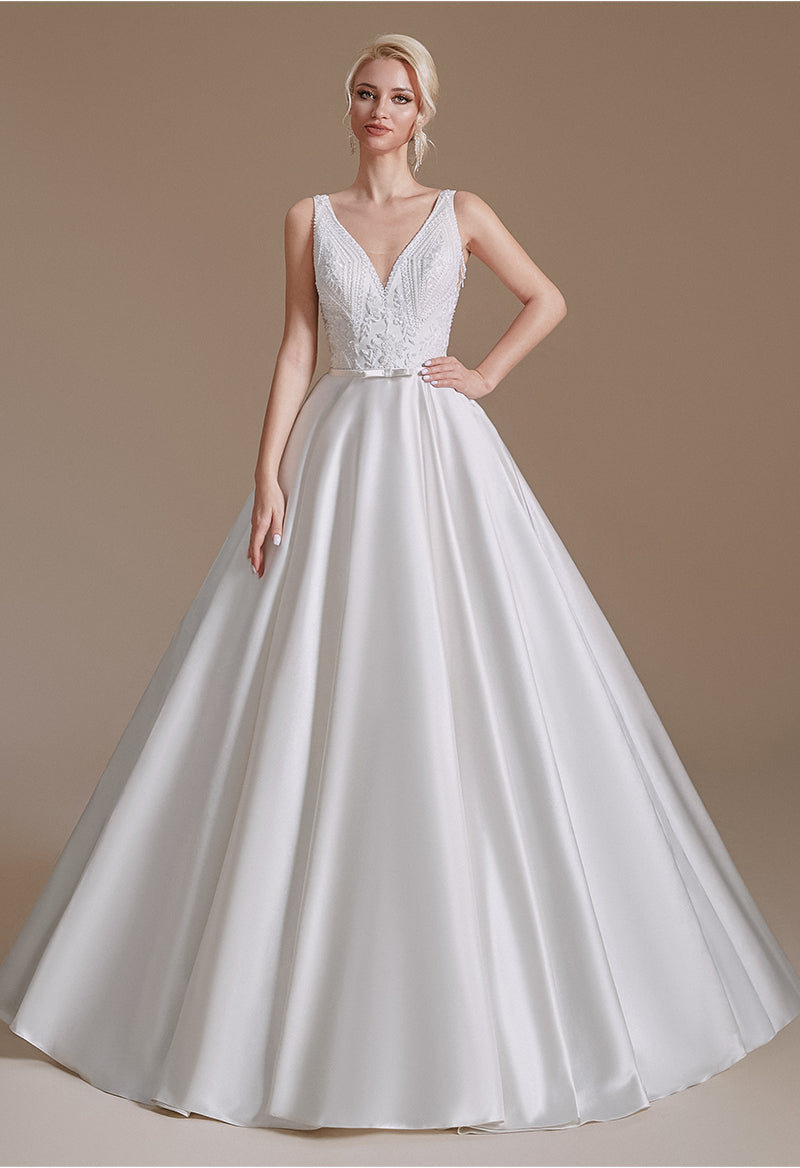 This eye-catching wedding dress features a simple V neckline and tulle skirt with a satin bodice and sleeveless design. Crafted with comfortable and breathable fabric, this stunning dress is suitable for all body types. With a timeless style that will give you a beautiful look on your special day.
