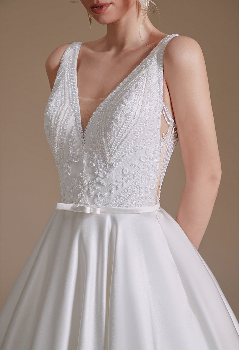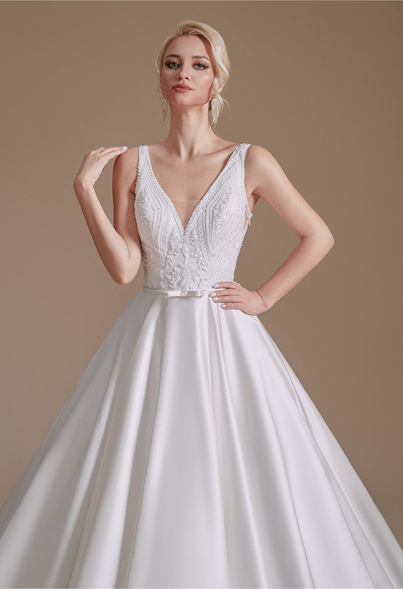 Simple V Neck Satin Tulle Sleeveless Wedding Dress