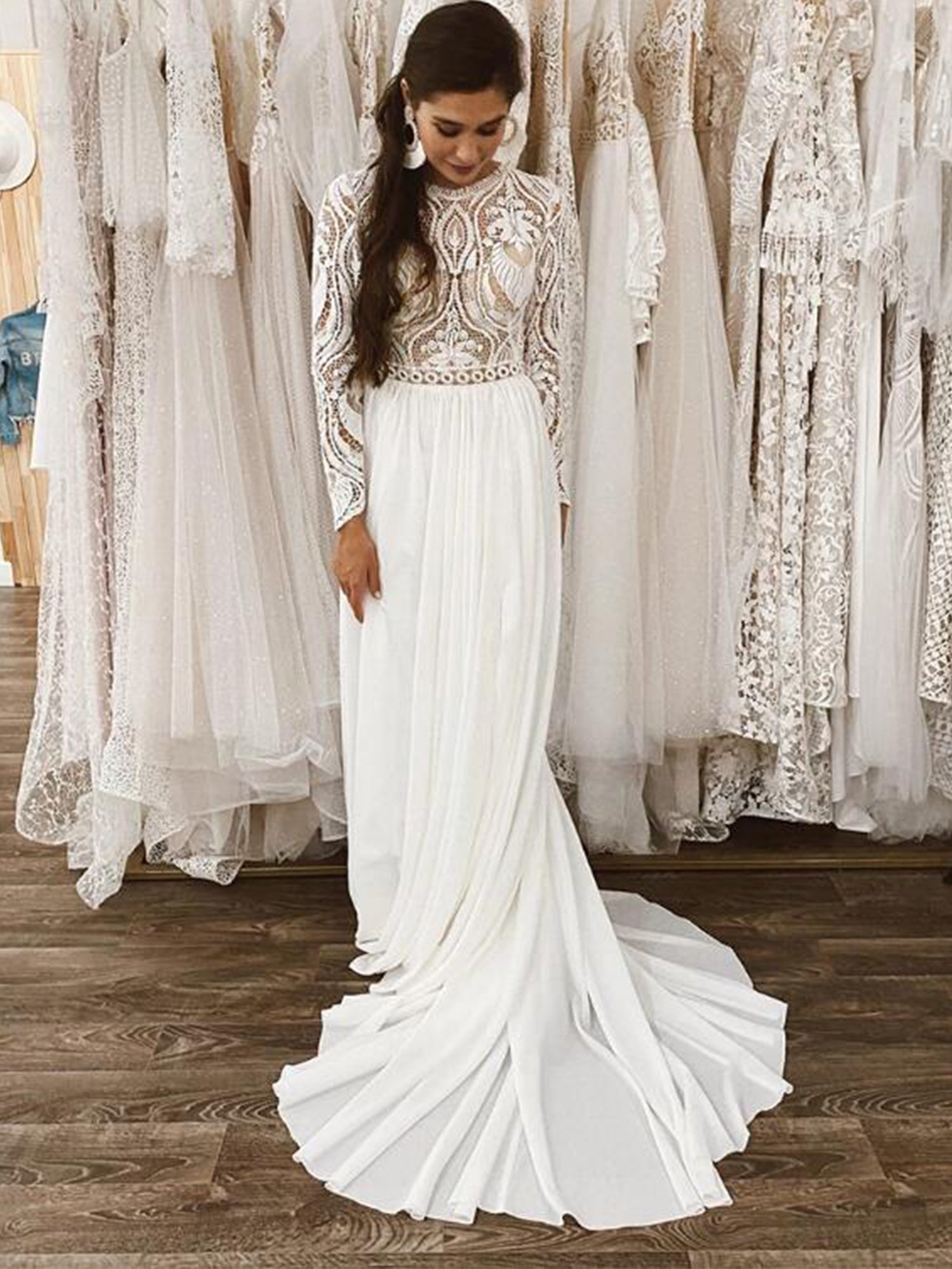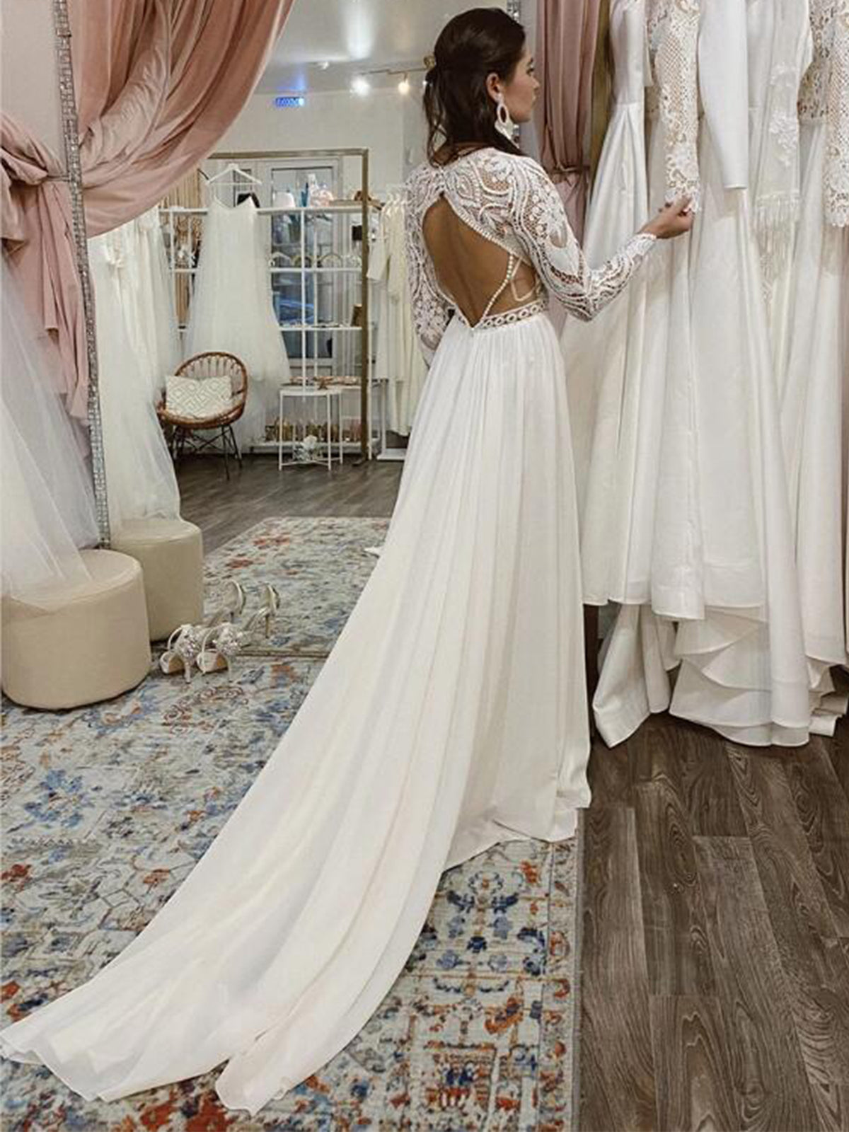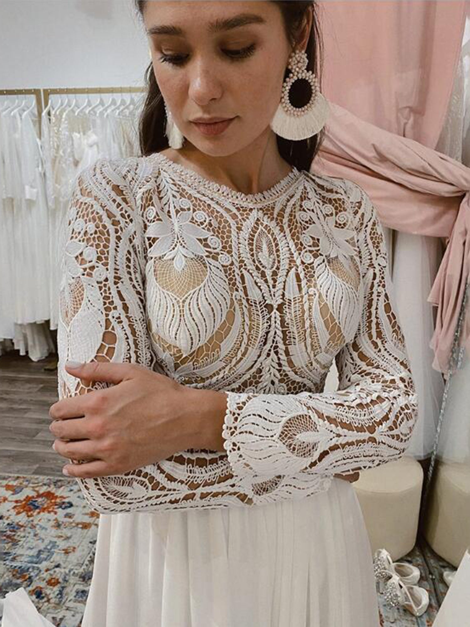 The wedding dress is open back and bridal fabric is made of lace and chiffon. Champagne lace transparent long sleeve design wedding dress upper body and ivory white sheath chiffon skirt. Create an elegant and comfortable wedding dress.